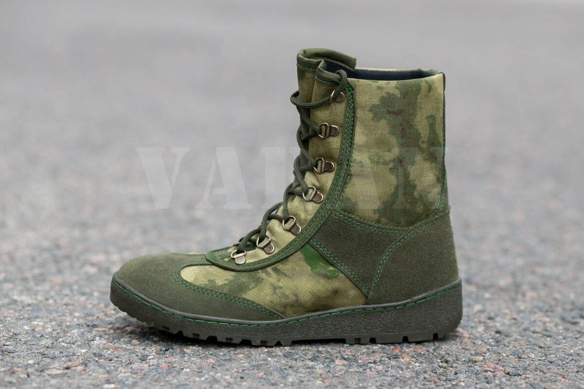 Модель выполнена в комбинации натуральной замшевой кожи “Велюр” и высокопрочного нейлона с плотностью 1000D расцветки Аттакс (мох) в сочетании с прочной сеткой 3D,которая пропускает воздух, тем самым обеспечивая отличную вентиляцию изделия. Высота ботинка в 19 сантиметров обеспечивают хорошую, плотную фиксацию ноги в берце. Язык глухой, что препятствует проникновению песка и других загрязнений внутрь обуви. Дополнительная вставка способствует правильному изгибу язычка в момент затяжки шнурков.
